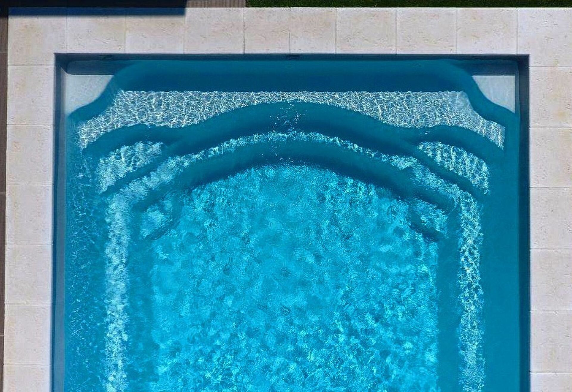 Piscine prêt à plonger sur les hauteurs de aix en Provence avec finition margelle blanche. Un espace à gagner en longueur de nage grâce à ça magnifique banquette de convivialité. Ce modèle est disponible en plusieurs dimensions de la mini piscine à la dix mettre.